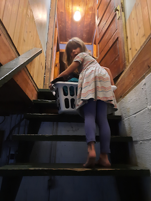 Back home, I helped with the laundry. I can take it out of the dryer and carry it up the steps from the basement. Also, I can put the wet clothes in the dryer, if Meema hands them to me out of the washer. We are a team.