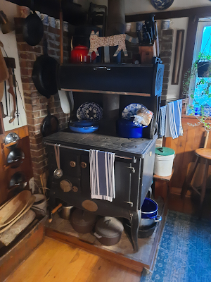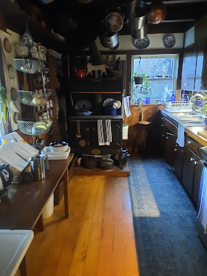 The stove itself was in need of a good wipe down--once I took the clutter from it. Greasy, dusty clutter, it goes without saying. And behind and under the stove was amazingly awful--withered bits of veg that had missed the compost bucket, lids to long departed pots, a mouse mummy were a few of the challenges I faced. And that was the second day. (I'm slow because I have to go sit down whenever my back complains and it complains a lot.)