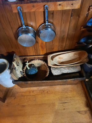 This is just the tip of the iceberg. In the pantry hangs a hemmed piece of feed sack material, just like it used to hang in my grandmother's pantry. It's material that her sister Mabel sent her from Alabama back in the Forties and it's right handy for wiping your hands. Next to it hangs a dainty little rick-rack trimmed apron that belonged to one of my neighbors.