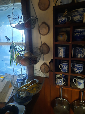 Visitors to our house almost always love our funky kitchen, its baskets and pots hanging from the ceiling beams, the wood stove and cast-iron cookware, the Blue Willow items, and the profusion of things. Things under things, things on top of things, things hanging on the wall, things in the window. But the bad thing about all these things is that they are serious collectors of grease and dust.
