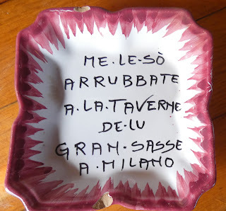 This ashtray, for example, was a souvenir from a visit to a restaurant near Milan. Back when John had an outdoor power equipment store, BCS, one of his suppliers, took us and other dealers on a tour in northern Italy. The tavern was famous for serving all sorts of game and we worked our way through meaty course after meaty course. I would have sold my soul for a salad, but none was forthcoming. But it was a memorable evening. So how to throw out this silly thing?