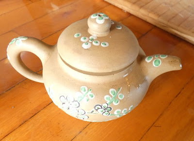 My mother's teapot. My father sent it from Burma during WWII. I think it's Chinese--and a rather special type of pottery. It always made excellent tea--though as it's so small, I rarely use it. Still . . .