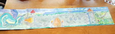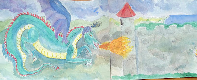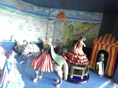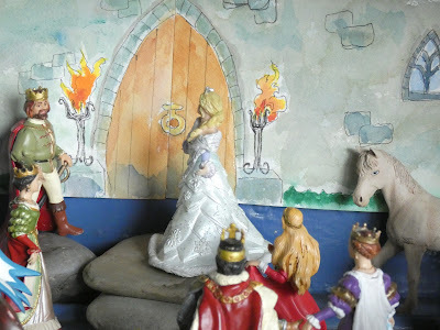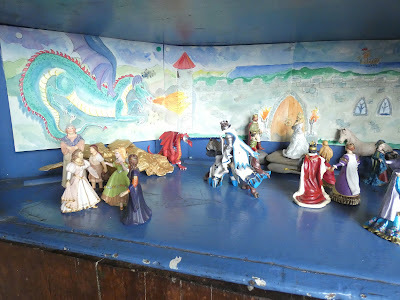 Outside, I taped the thing I cut out to the bench, just like in the picture I painted. Then I wanted to go to The Room.