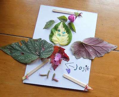 I made a fairy named Josie. She has wings and a wand (Meema cut out the star for me.) I cut up little pieces of the leaves' stems to make her feet and her fingers. (Her arms are kind of long.) She has a flower in her hair. Her eyes messed up a little because the marker didn't work so good on the leaf, but I think she still looks pretty good.
