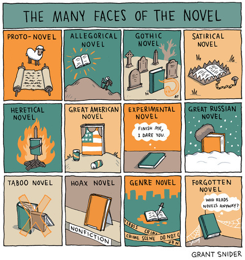 Illustration for John Sutherland’s review of “The Novel: A Biography” by Michael Schmidt, appearing in the August 10 NY Times Book Review. Thanks to AD Nicholas Blechman!