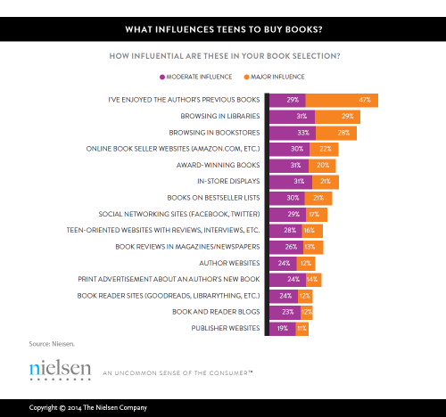 Despite teens’ tech-savvy reputation, this group continues to lag behind adults when it comes to reading e-books, even with the young adult genre’s digital growth relative to the total e-book market. While 20% of teens purchasing e-books, 25% of 30-44 year olds and 23% of 18-29 year olds buy digital copies. While younger readers are open to e-books as a format, teens continue to express a preference for print that may seem to be at odds with their perceived digital know-how.