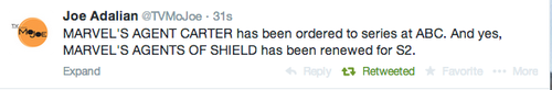sleepyavengers: IT’S HAPPENING GUYS AGENT CARTER HAS BEEN ORDERED TO SERIES BY ABC RE-NEWLY FOR AGENTS OF SHIELD We have legitimate confirmation. It’s happening, guys. It’s fucking happening.