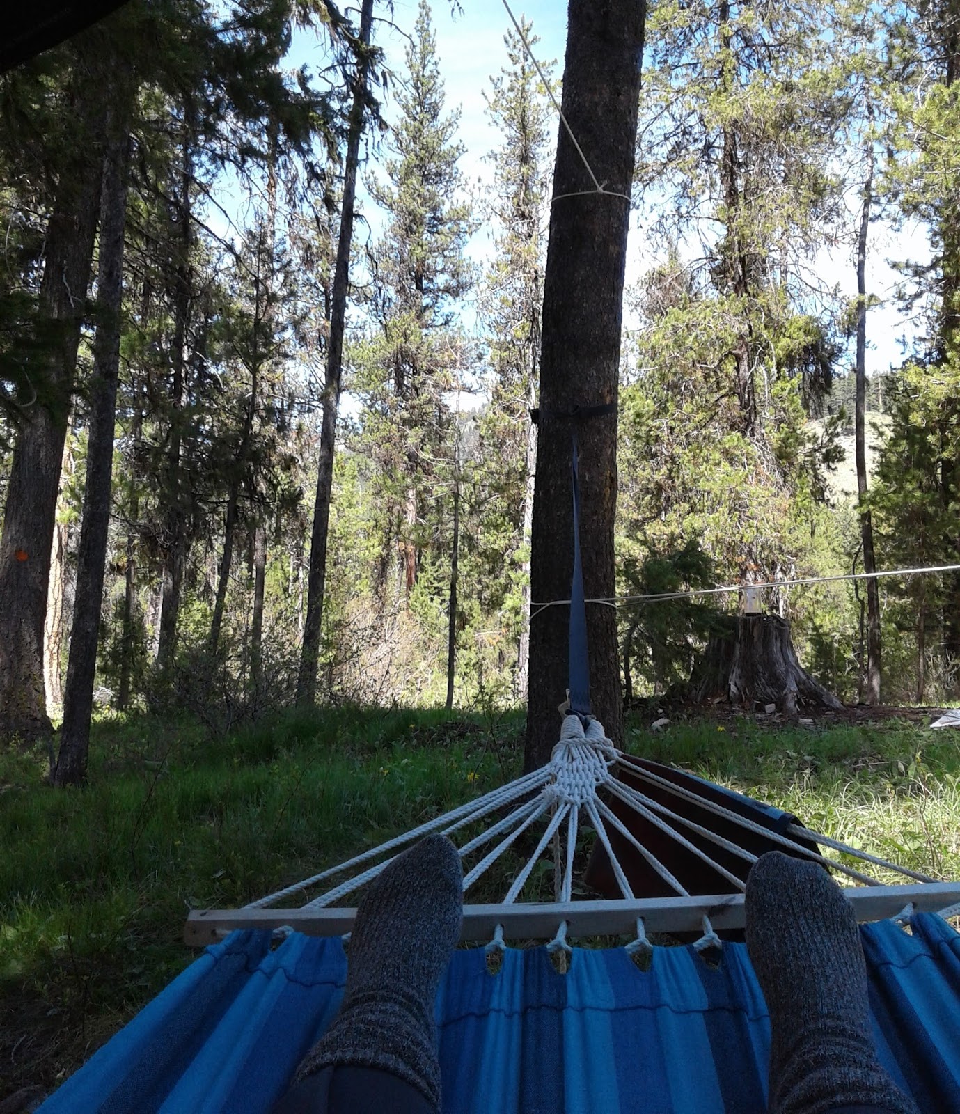 Oh, every year, I look forward to heading to the hills. My husband and I love, love, love to camp in the boonies, where we are alone with nature (and our dogs). The only sounds to be heard are those of the breeze blowing through the trees, the water rushing over boulders in the river, and an occasional chipmunk scampering up a tree. Well, there's also the sound of our little dog Rascal begging for the ball to be thrown again and again. He equates camping with an endless round of playing fetch. My husband and I equate camping to peaceful rejuvenation. No internet. No cell phones. No technology, except for our Kindles. We each have our own hammock, from which we strive to read as many books as possible.