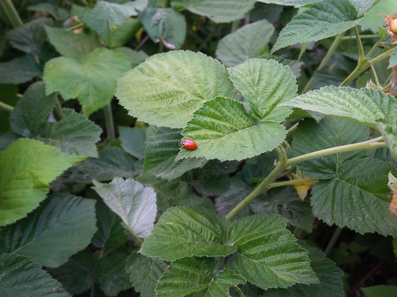 And I was really looking forward to an amazing crop of blackberries this year. So I did more research. My online research found a handful of organic gardening sites that explained my other option: hard work. If I chose to not use poison, I would have to check the canes daily for damage, cut out the entire damaged cane, and discard it - removing it completely from the garden area. I went with that option. It has been a lot of work. And I discovered that the beetles mostly go after the older canes that I had pruned last fall. I also noticed that the bush would grow leaves over the ends of the canes in an attempt at self-preservation.