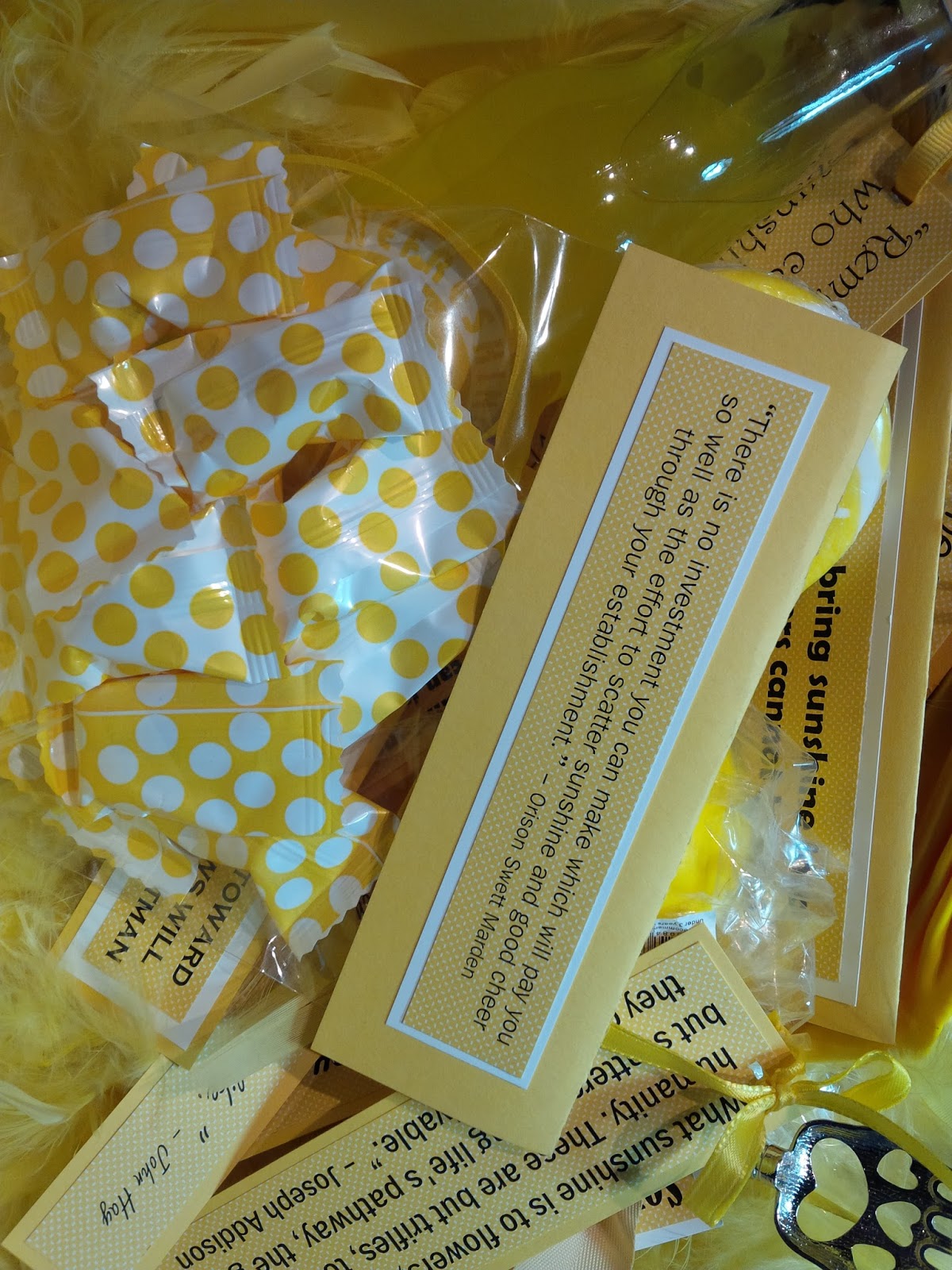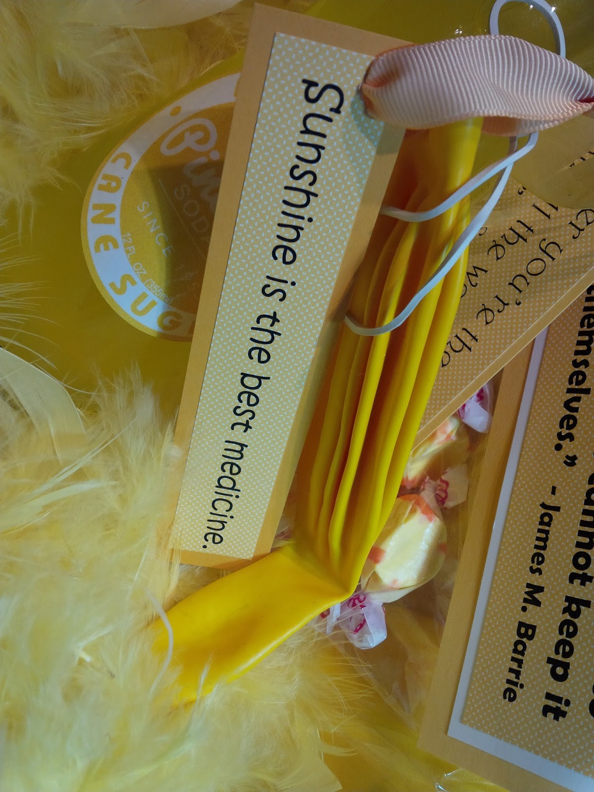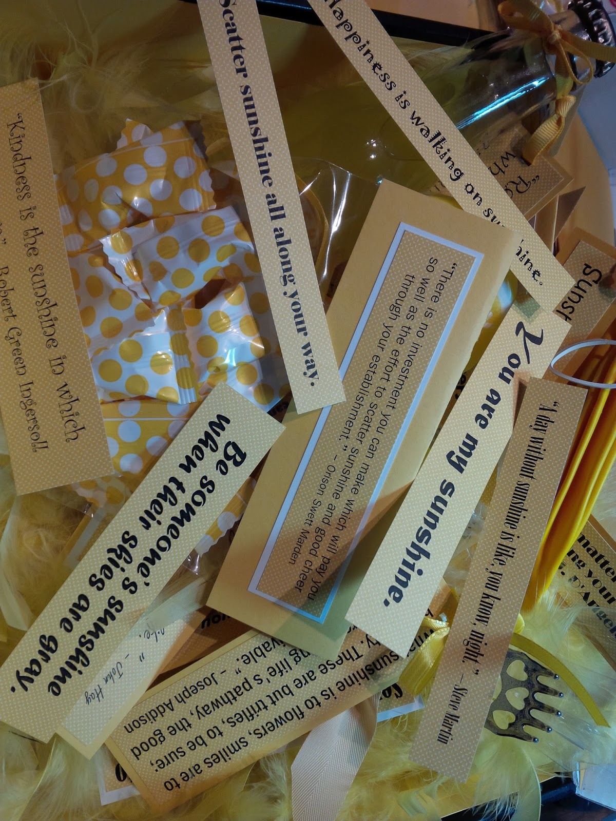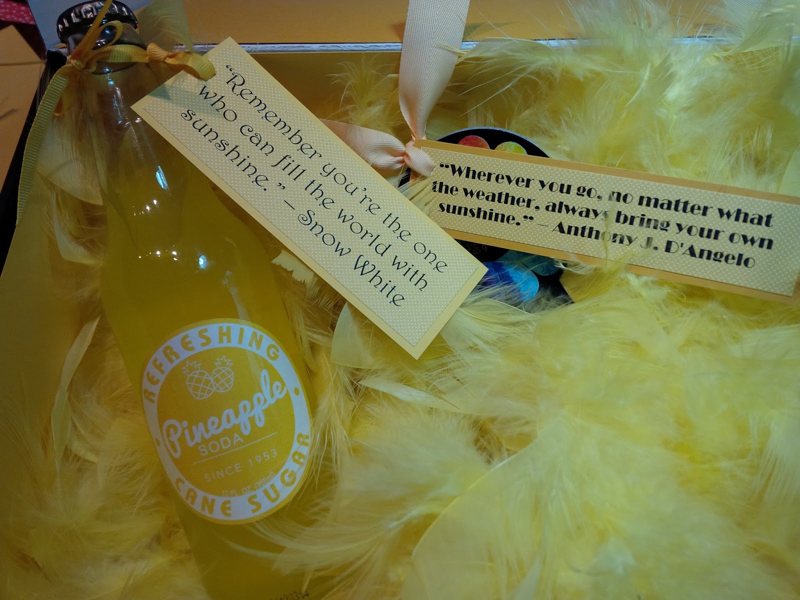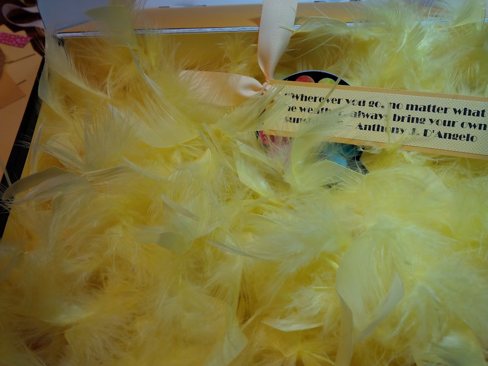6: Attach sunshine sayings to the items going into the box - for example, I added a boa (because everyone needs a yellow feathered boa, right?) and I attached the saying, “Wherever you go, no matter what the weather, always bring your own sunshine.” - Anthony J. D'Angelo: