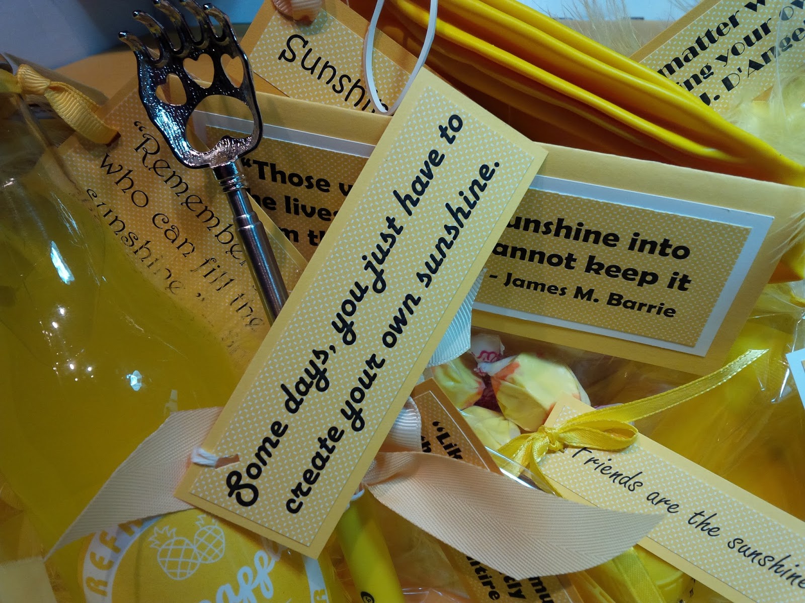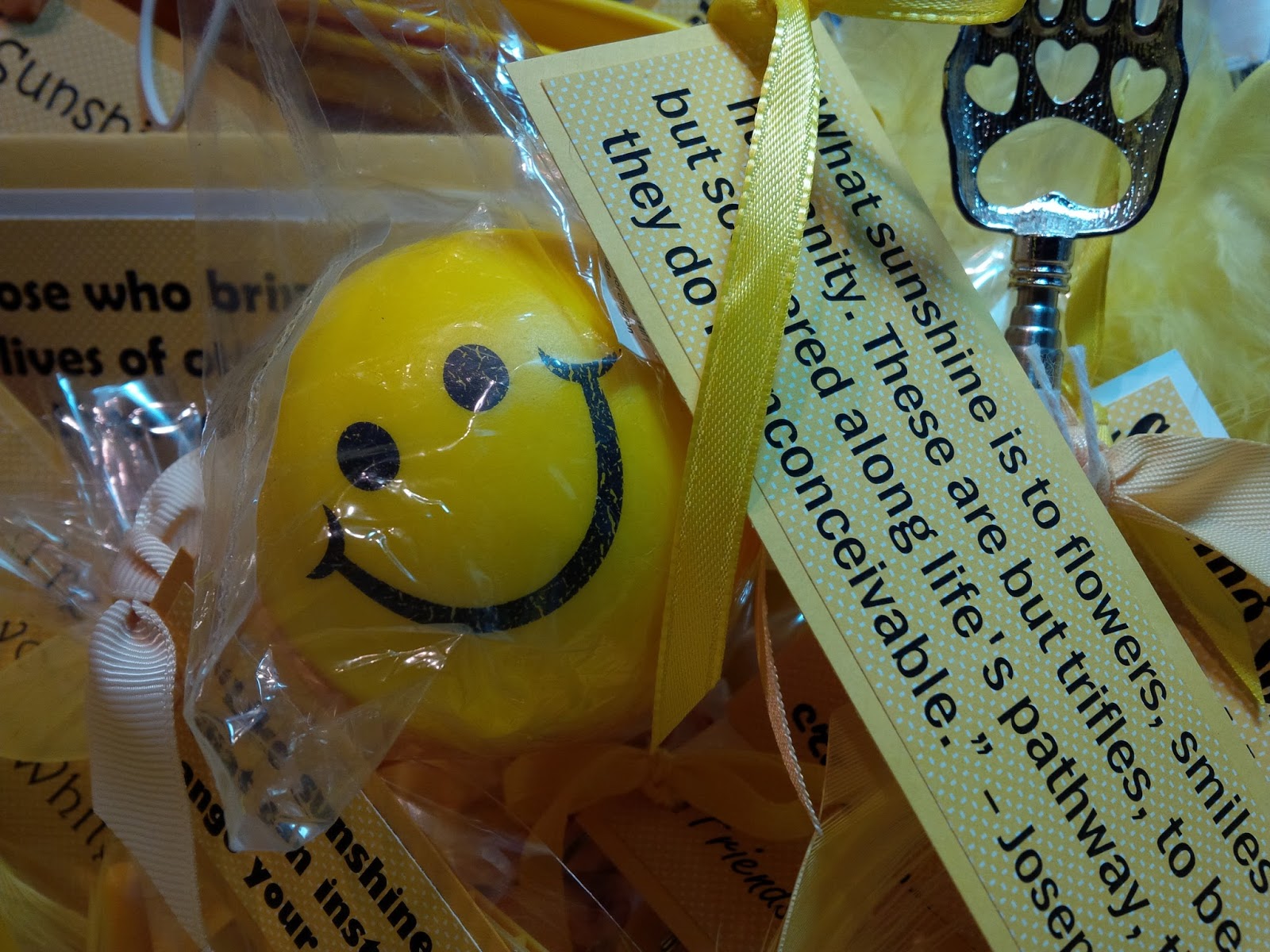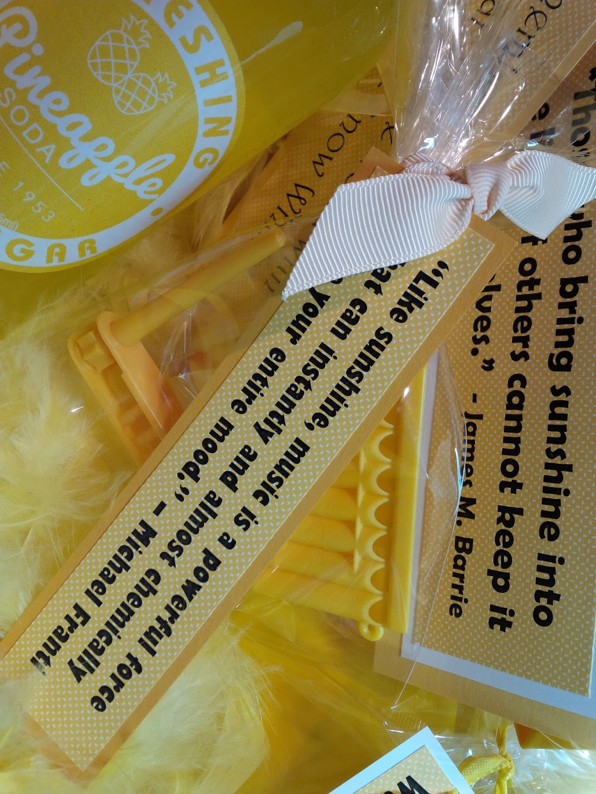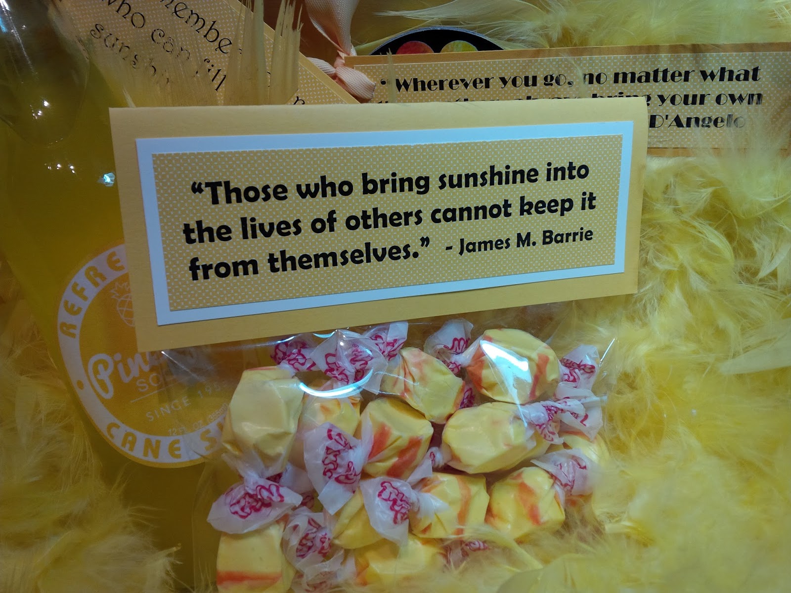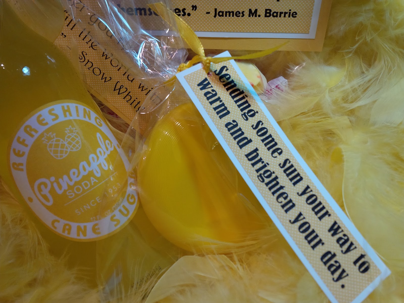 6: Attach sunshine sayings to the items going into the box - for example, I added a boa (because everyone needs a yellow feathered boa, right?) and I attached the saying, “Wherever you go, no matter what the weather, always bring your own sunshine.” - Anthony J. D'Angelo: