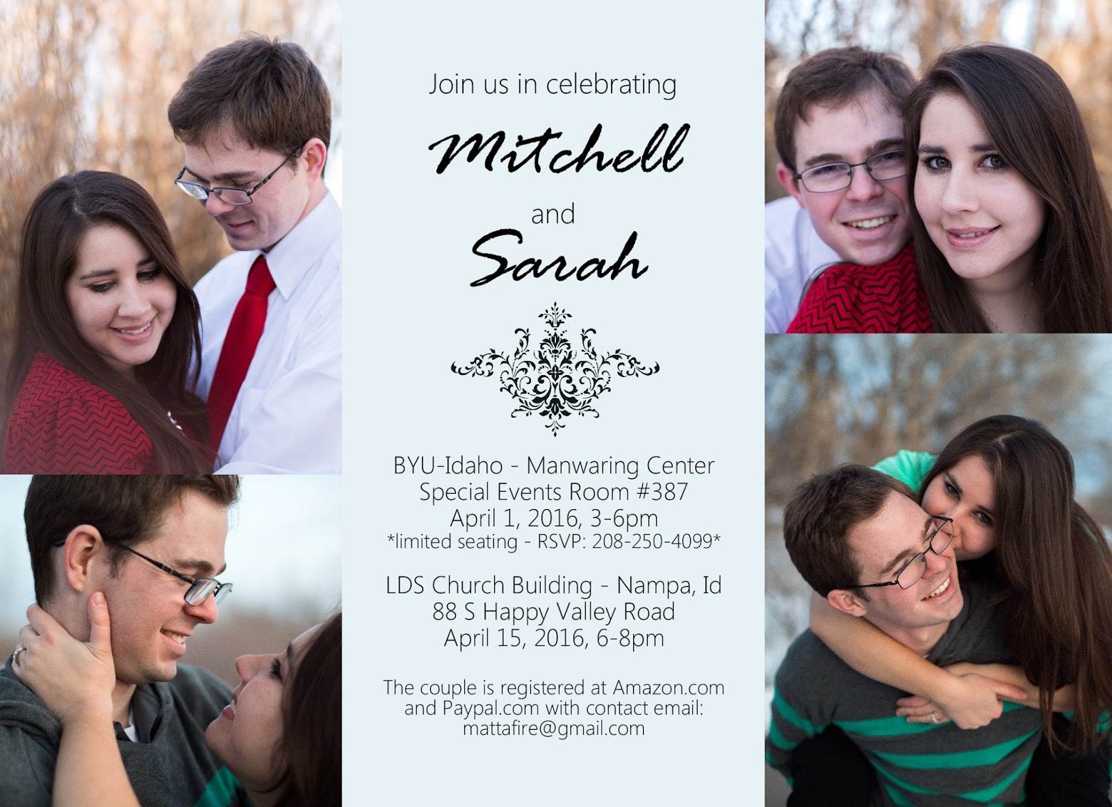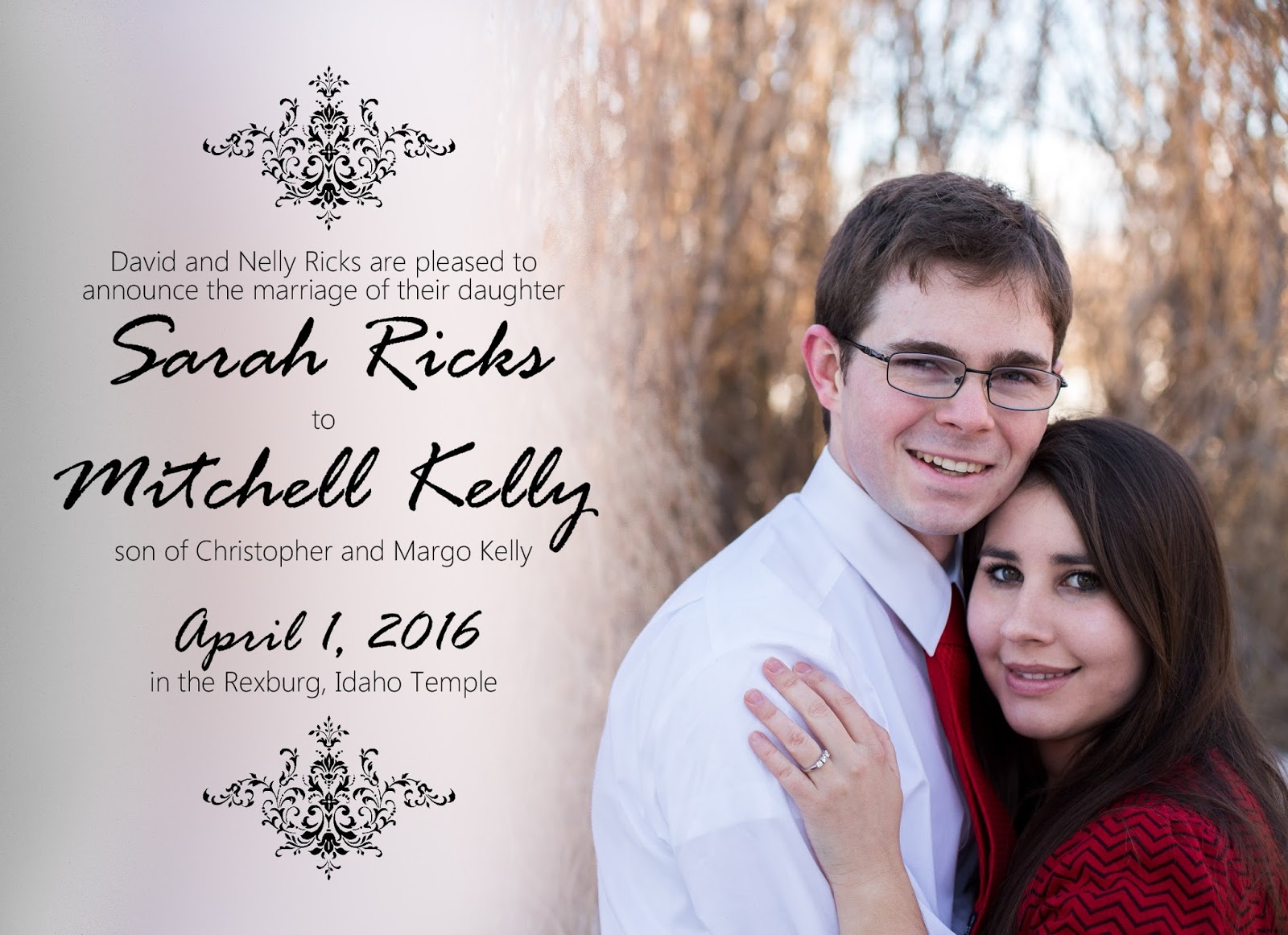 There you have it. ... Oh. Wait. I forgot one other thing ... I also designed the wedding announcements for Mitchell and Sarah. Here you go, front and back: