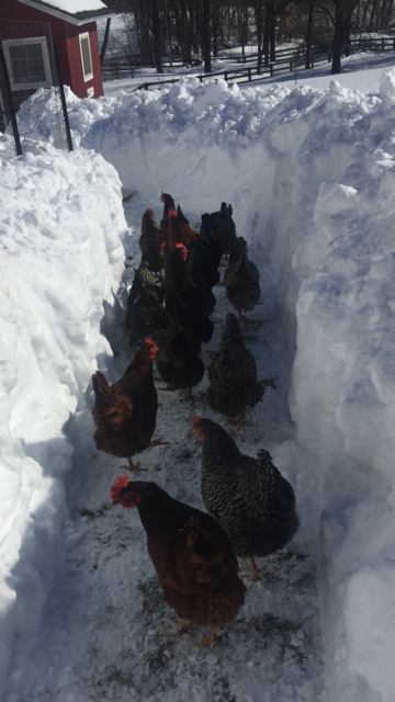 I love seeing tracks in the snow. Plus it was so sparkly!So after digging to the coop, I dug out an equally deep front walk (about 35ft) because our front door faces north and would take forever to melt. My husband and boys were working on our driveway, which took a couple of days (we're in the country so our driveway is just under 200 ft and the snow had drifted, making it at least 3-4 ft deep there).