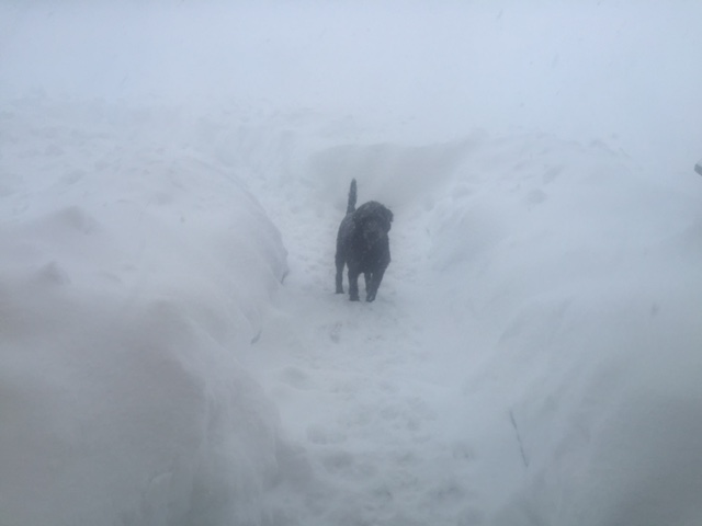 Rula's dog in the first path I tried digging only hours into the storm. There was a lot of snow yet to come!Anyway, on Sunday, the sun came out and I had to re-dig all the way to the coop. I also needed to dig an area for the dogs to do their business. They had managed to do so in a small area during the storm (they were confused and reluctant), but my larger dog (think super tall poodle size in shoulder height) sank in the snow when she tried running off. I thought I was going to have to pull her out, but after some struggling, she made it back to the door safely.
