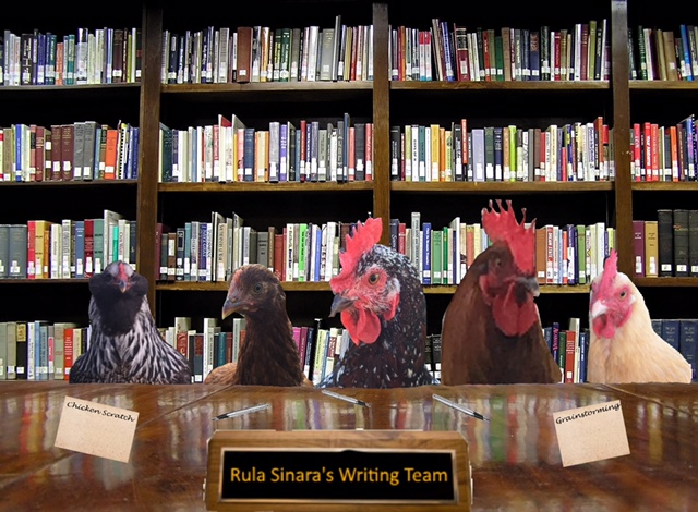 Rula's flock entertainmentWhen I told my teen that the digging left every muscle in my hands and arms aching (not to mention my back and the tendinitis in my ankle) and that typing was going to hurt, he told me I should rely on my writing team and came up with this pic: