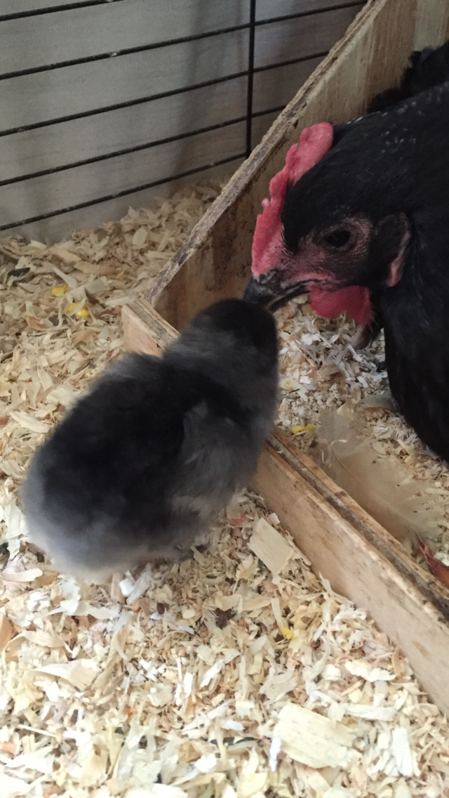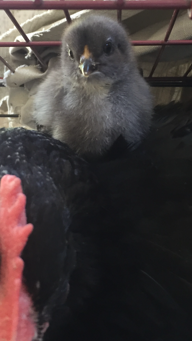 Hiding under mama's wingWatermelon is proving to be an amazing mother. She's protective, tolerant, immediately taught them to drink from a glass bottle waterer (the kind in rabbit/hamster cages)...which she remembered from her chick days. And when I took her out for a second, so that I could clean a spot, she freaked and wanted to get back in the cage with her babies. I set up a rabbit cage in the coop so that they'd be safe from trampling/pecking, yet they'd still be with the flock. Kind of a brooder/nursery.The baby's are doing great and growing quickly. The cutest thing is that they like sitting on top of their mother, piggy-back style.