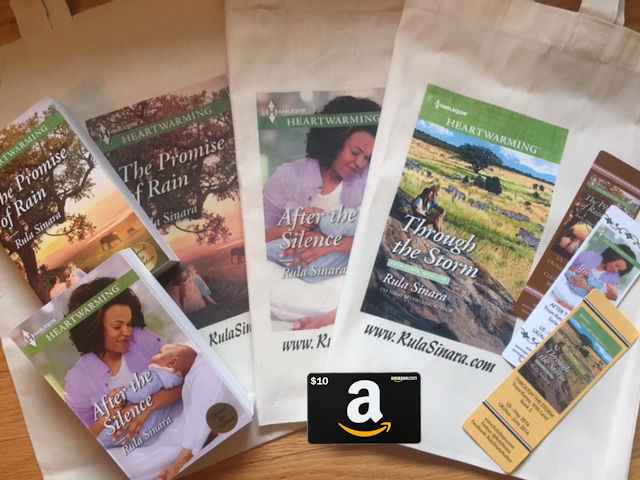 US PRIZE PACK: One winner will receive 3 'From Kenya, With Love' series canvas tote bags (one of each book), bookmarks, autographed copies of The Promise of Rain and After the Silence, and a $10 Amazon gift card.