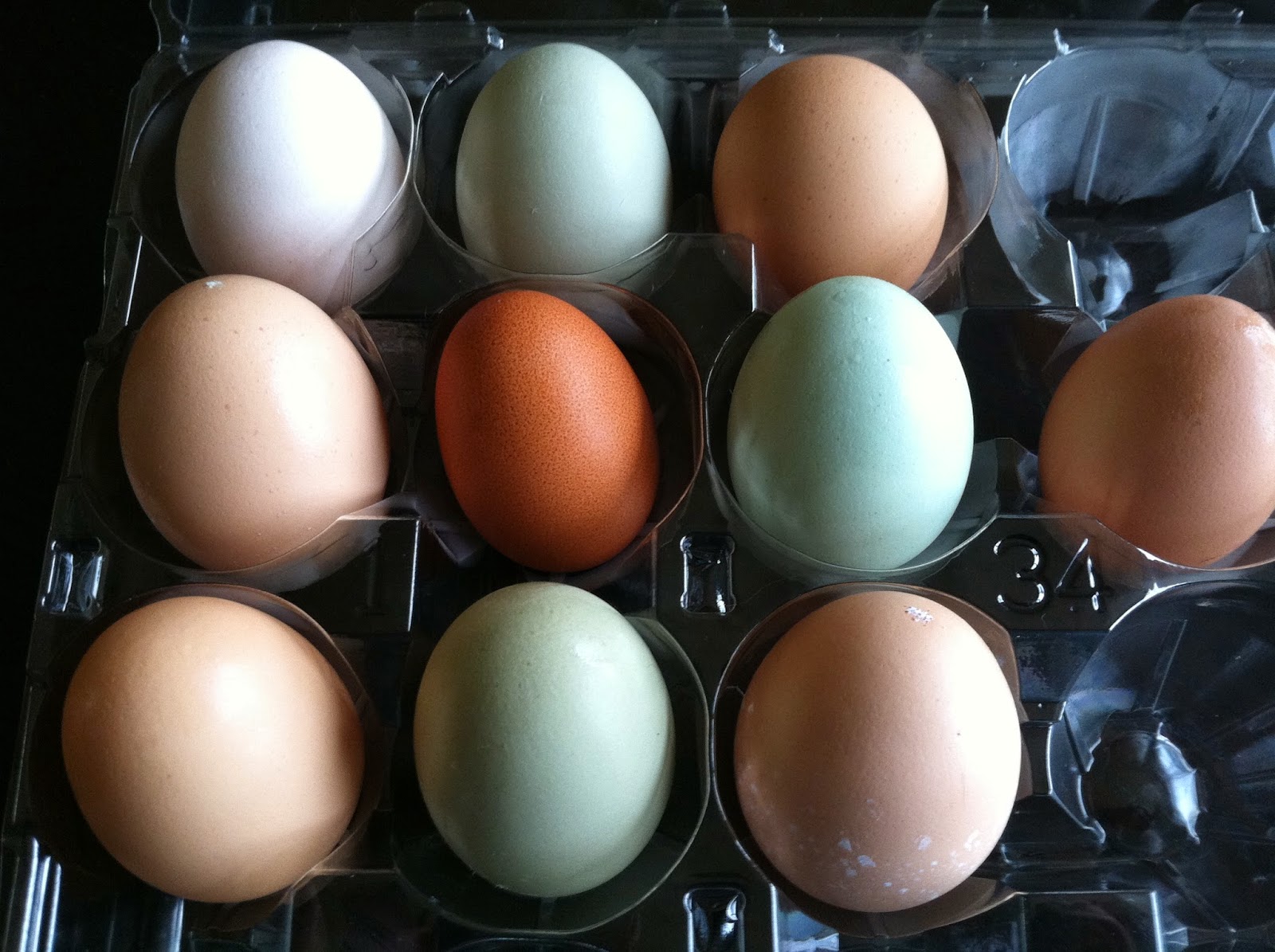 The hen up front is Rain, an Easter Egger. She lays pinkish brown eggs. My other EE, Moon (not pictured), lays green eggs.