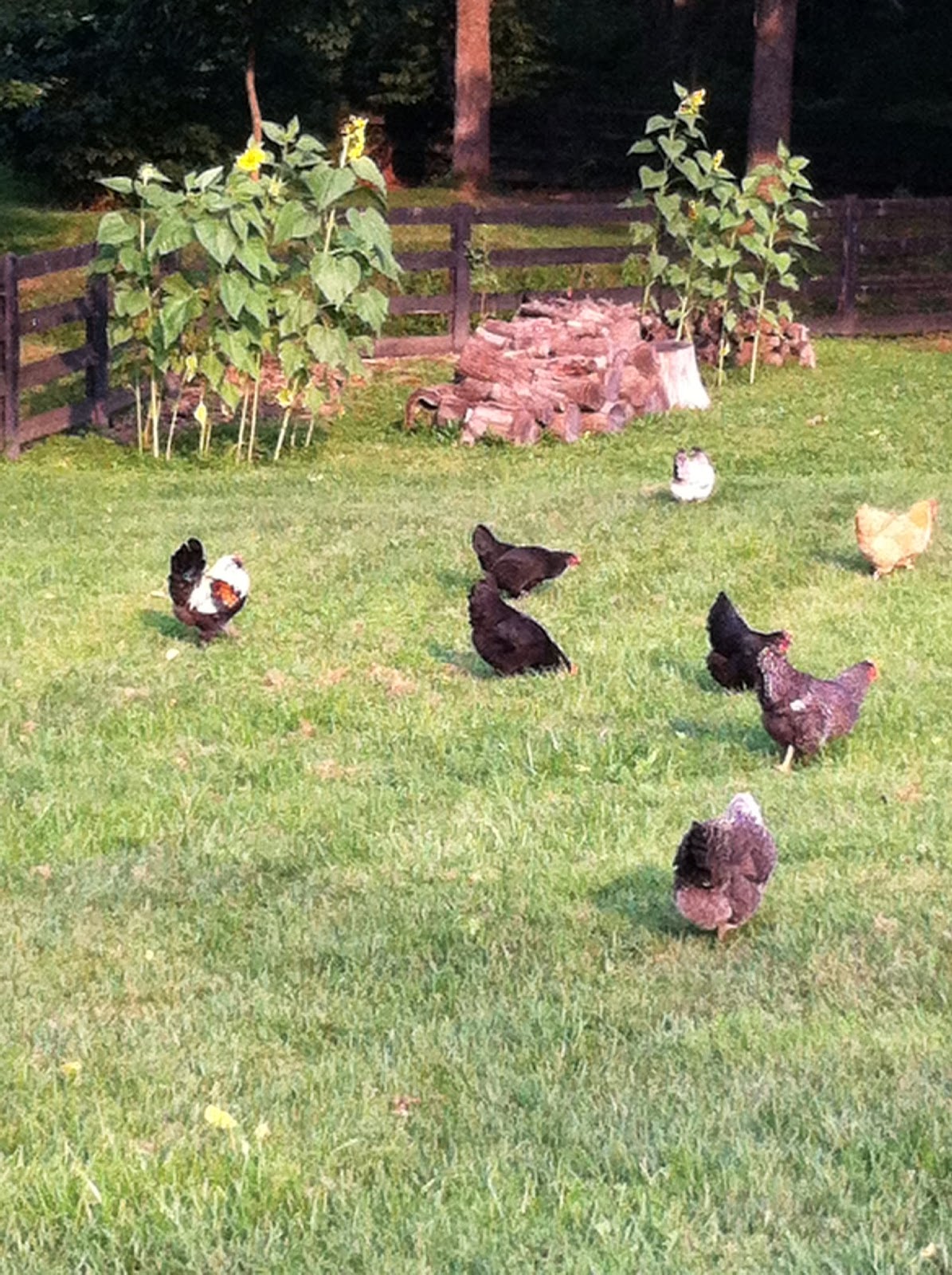 While helping my rooster scare off a hungry hawk this morning, it occurred to me that I never posted updated photos of my backyard flock. That handful of chicks I posted pics of back in March quickly grew to a flock of 18 chickens (they call the addiction 'chicken math'). One of them ended up being a rooster, which is fine since we live in the countryside. He has saved quite a few hens from hawk attacks, but we did lose one not long ago...and another to egg-binding complications. So our current number is 16, including the roo, Excalibur.
