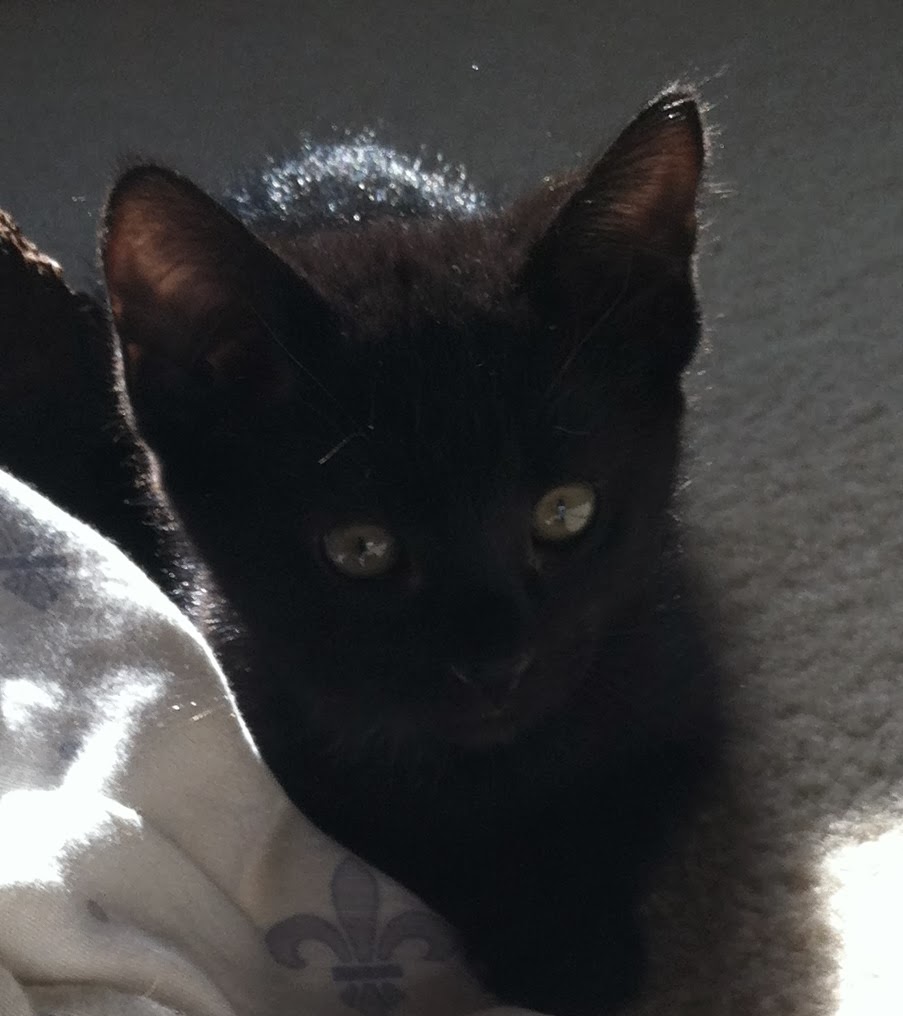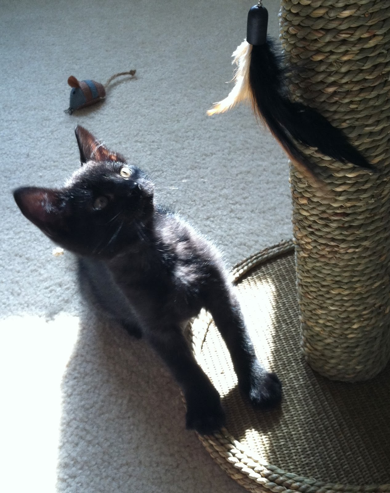 Last week we adopted kittens from our local SPCA. They're brothers who lost their mother to a car accident. My kids named them Storm and Nimbus (as in the cumulonimbus thunderstorm clouds). We got them at 8-9 weeks of age and they're growing very quickly! Nimbus is the black one (I think he's actually turning out to be what's called a smoke ghost...you can see his tabby pattern in the right light) and Storm is the brown Mackerel tabby...both gorgeous and sweet.