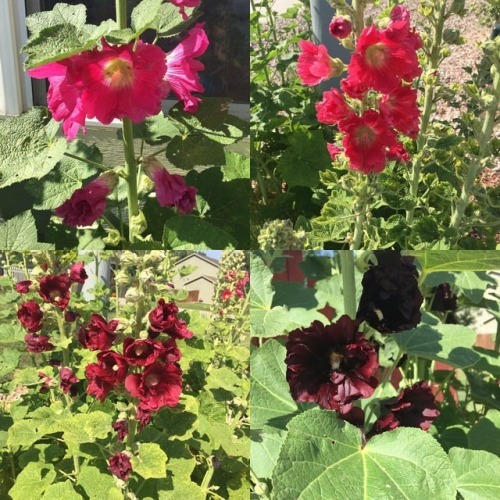Hollyhocks galore!! I didn’t plant any of these. They just showed up lol #summerishere #nofilter #hollyhocks