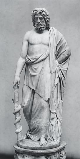 A statue of Aesculapius, the god of medicine for both the Greeks and Romans. Notice the snake rising up the staff. A hint of the caduceus that symbolises doctors and paramedics today.