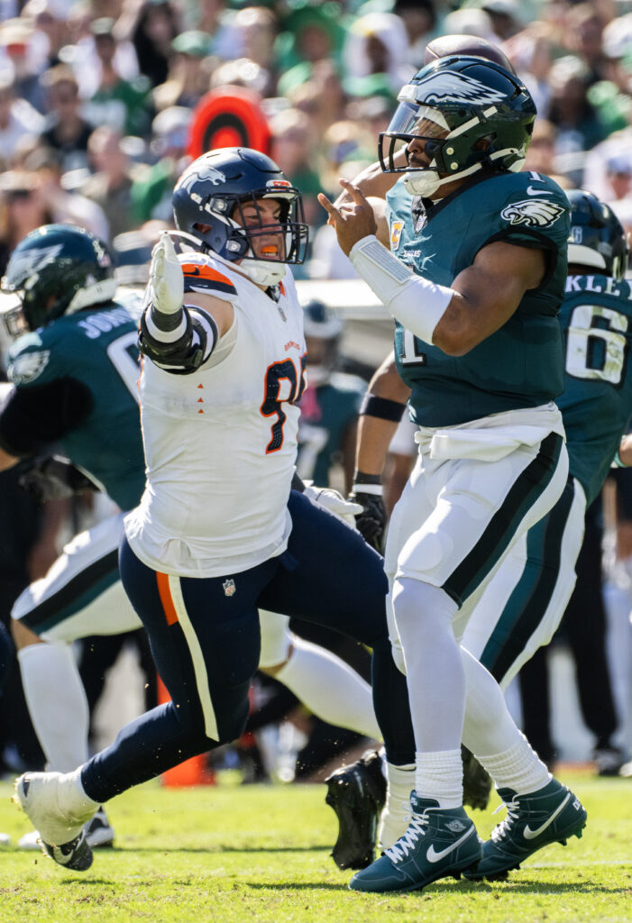 Denver Broncos defensive end Sai’Vion Jones (95) pressures Philadelphia Eagles quarterback Jalen Hurts (1) during the first half Sunday, Oct. 5, 2025, at Lincoln Finanacial Field in Philadelphia, Pa. (The Gazette, Christian Murdock)“One thing our team is not going to do is ever quit,’’ said outside linebacker Nik Bonitto, who had 2.5 of Denver’s six sacks to give him seven this season. “We’ve got a lot of resilient guys in the locker room. … So hats off to everybody.”