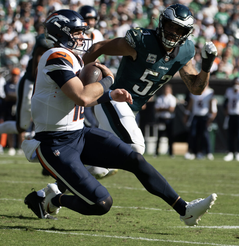 Denver Broncos quarterback Bo Nix (10) slides to the ground after running against Philadelphia Eagles linebacker Zack Baun (53) during the second half Sunday, Oct. 5, 2025, at Lincoln Finanacial Field in Philadelphia, Pa. (The Gazette, Christian Murdock)The Broncos (3-2) move ahead in Week 6 to play the Jets in London. The Eagles (4-1) and Fangio are the latest football victims from the rise of Nix. The Broncos, finally, have found their quarterback.
