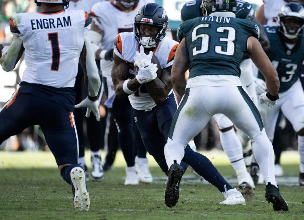The Broncos trailed, 17-10, with under 8 minutes left in regulation with a first down at the Philadelphia 11-yard line. Quarterback Bo Nix rolled out right on play action and surveyed the short field. Engram came off his initial block and found a soft spot in the middle of Philadelphia’s coverage. Nix delivered the quick pass, and Engram made his move.