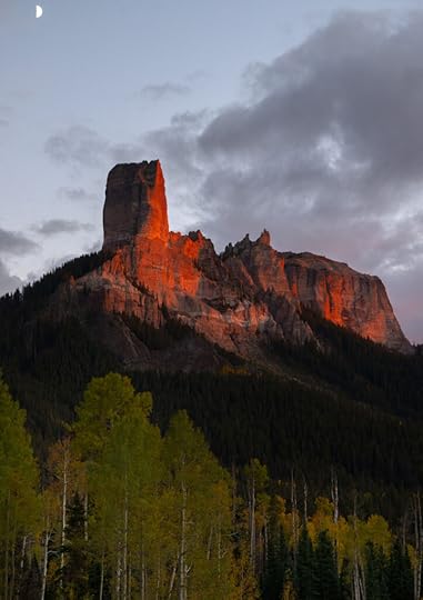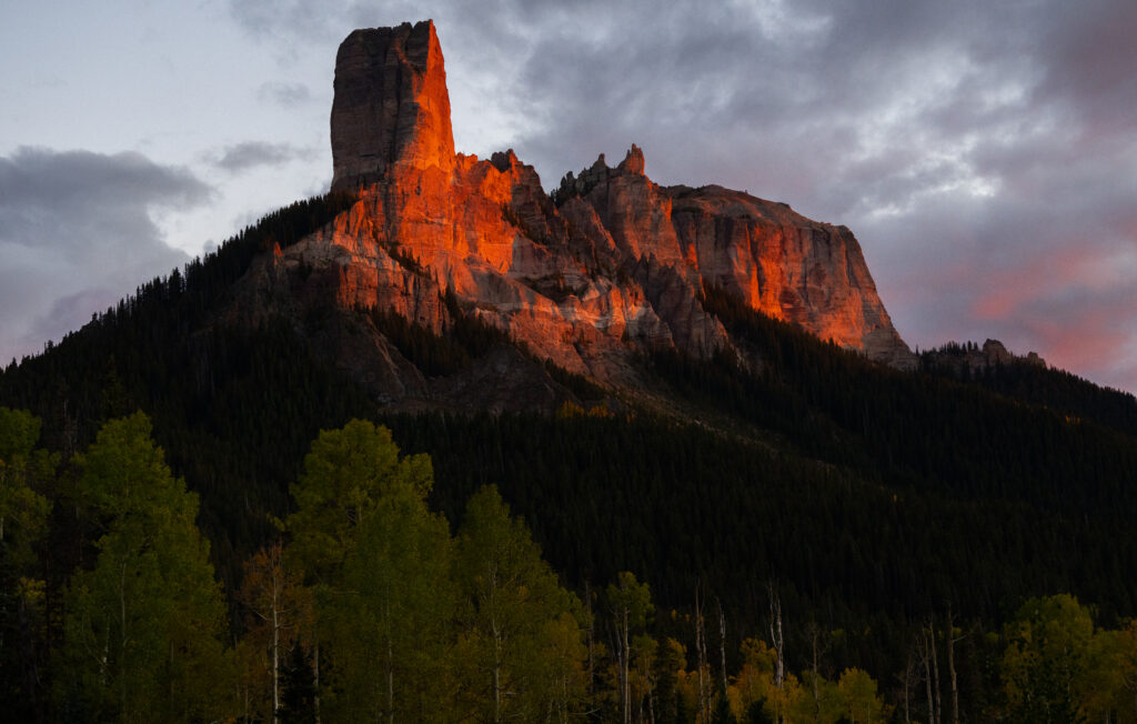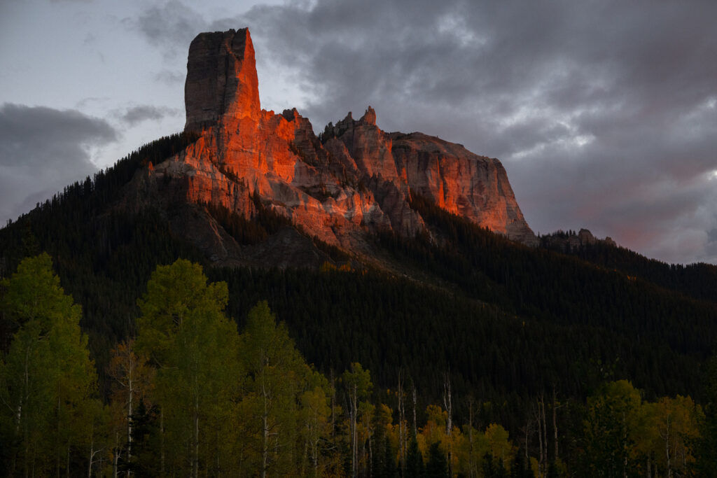 The setting sun casts a red glow on Chimney Rock and Courthouse Mountain Monday, Sept. 29, 2025, on Owl Creek Pass east of Ridgway, Colo. (The Gazette, Christian Murdock)
