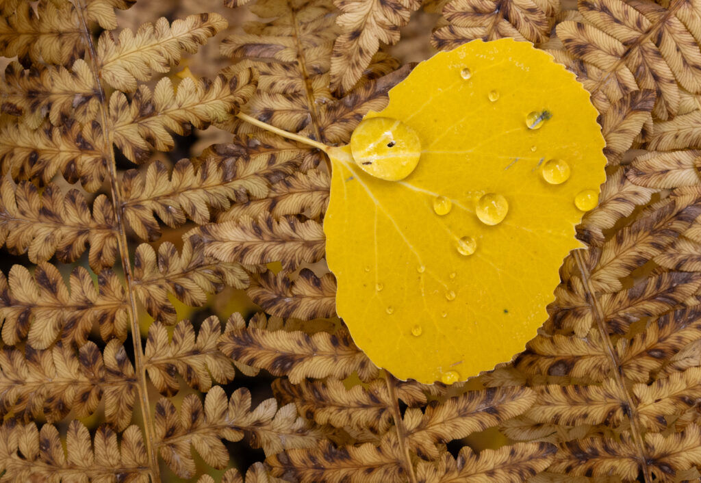 Drops of water lie on an aspen leaf as it rests on the top of a braken fern in the forest west of Kebler Pass Monday, Sept. 29, 2025, near Crested Butte, Colo. (The Gazette, Christian Murdock)