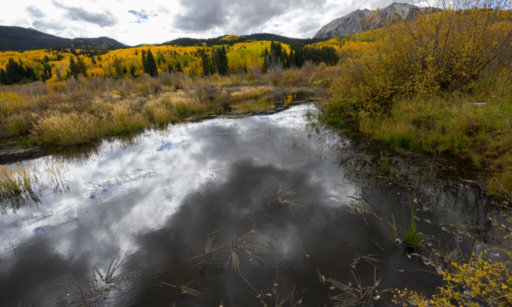 Rain drops fall on a pond on Kebler Pass as the water reflects the dark clouds above on Monday, Sept. 29, 2025. (The Gazette, Christian Murdock)