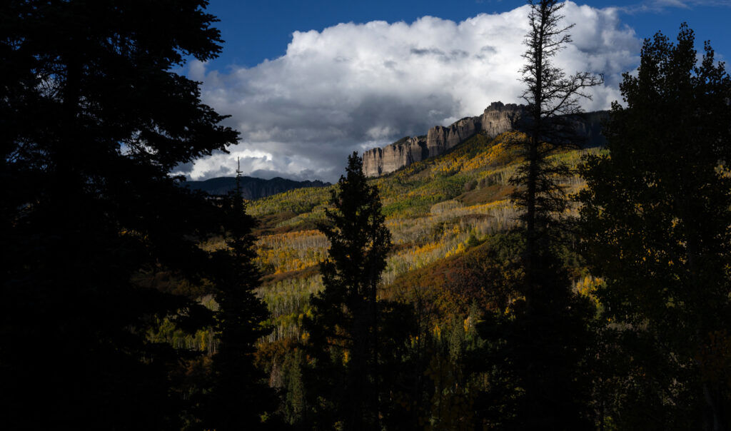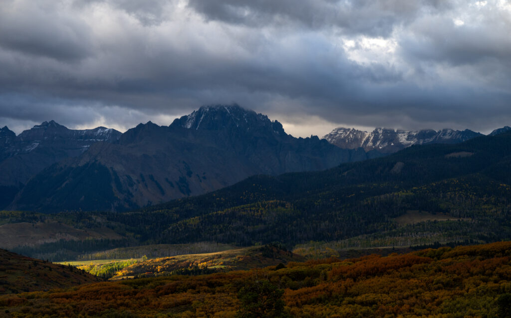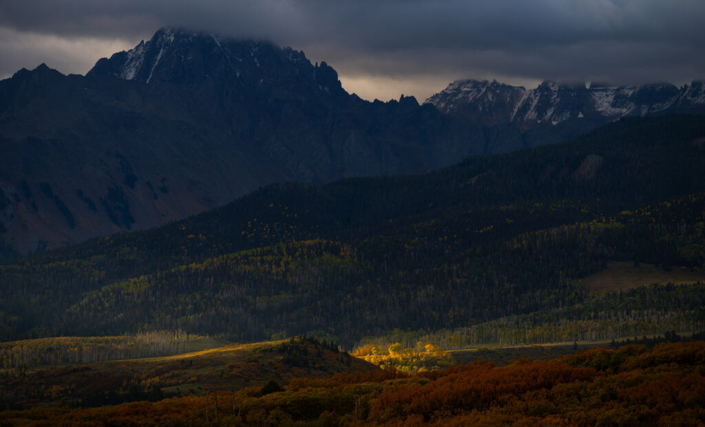 The sun breaking through the clouds cast a stream of light on the turning aspens below the San Juan Mountains on the Dallas Divide Tuesday, Sept. 30, 2025, west of Ridgway, Colo. (The Gazette, Christian Murdock)