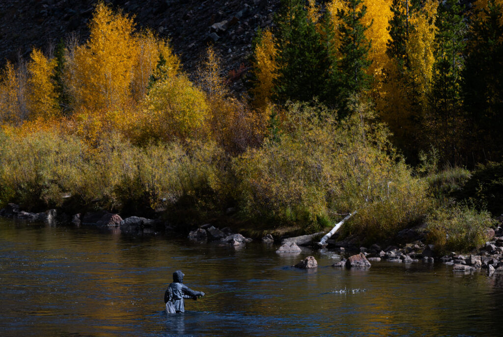 A fly fisherman casts his line on the Taylor River Monday, Sept. 29, 2025, as the fall colors reflect on the water. (The Gazette, Christian Murdock)