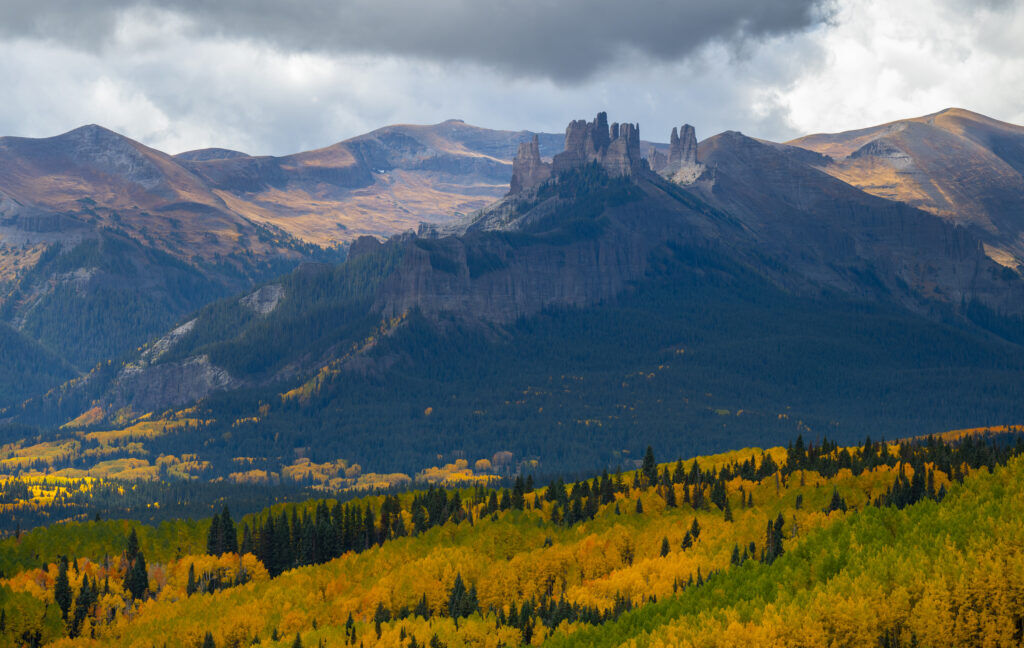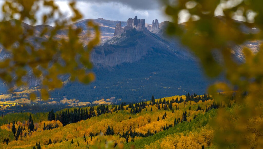 The Castles stand above the turning aspens on Ohio Pass between Gunnison and the Kebler Pass summit Monday, Sept. 29, 2025. (The Gazette, Christian Murdock)