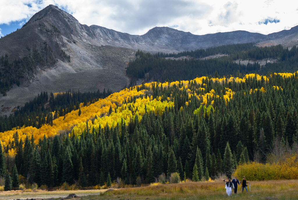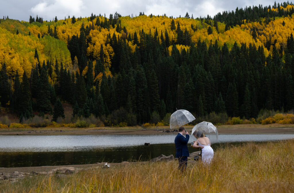 Denver photographer Marcela Suter and Kevin and Sudan Piersol wait for a rain shower to pas’s while Suter captured their wedding day among the turning aspens at Lost Lake on Kebler Pass outside Crested Butte, Colo. The couple from Myerstown, Pa., searched online for a beautiful play to elope and found Crested Butte. The couple was wed on the edge of the lake. (The Gazette, Christian Murdock)