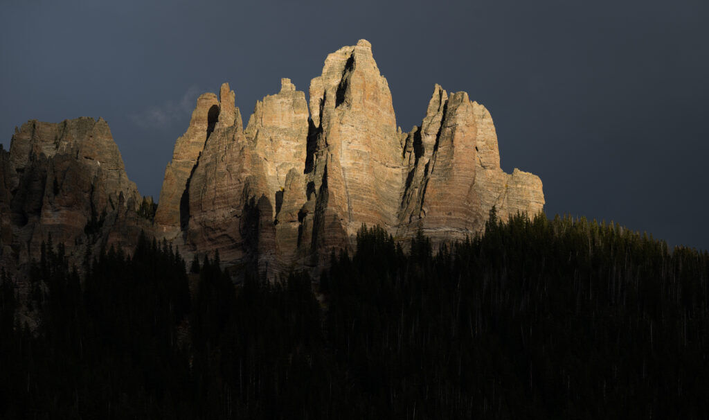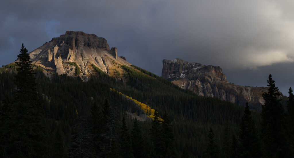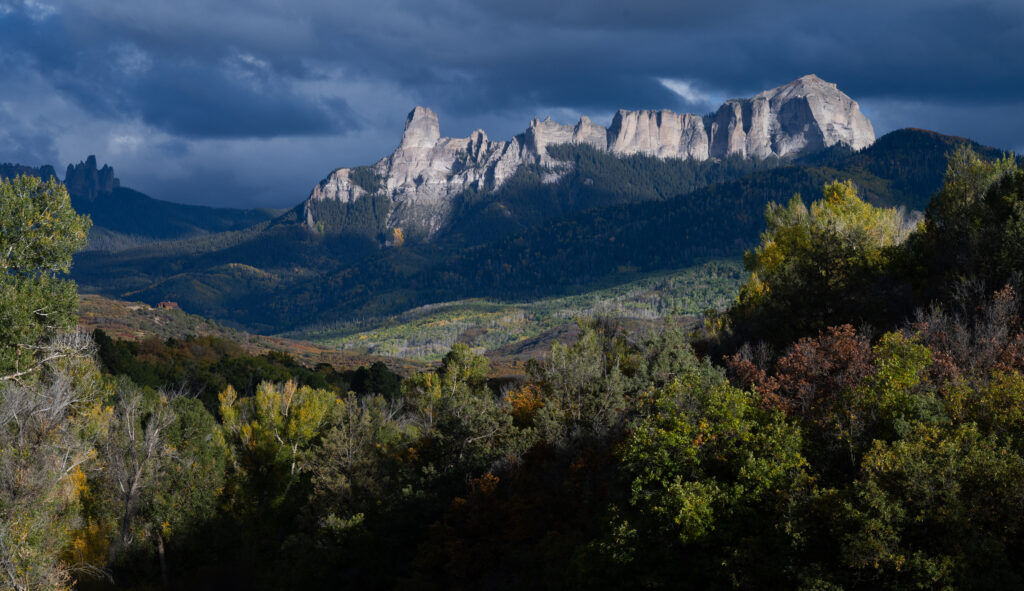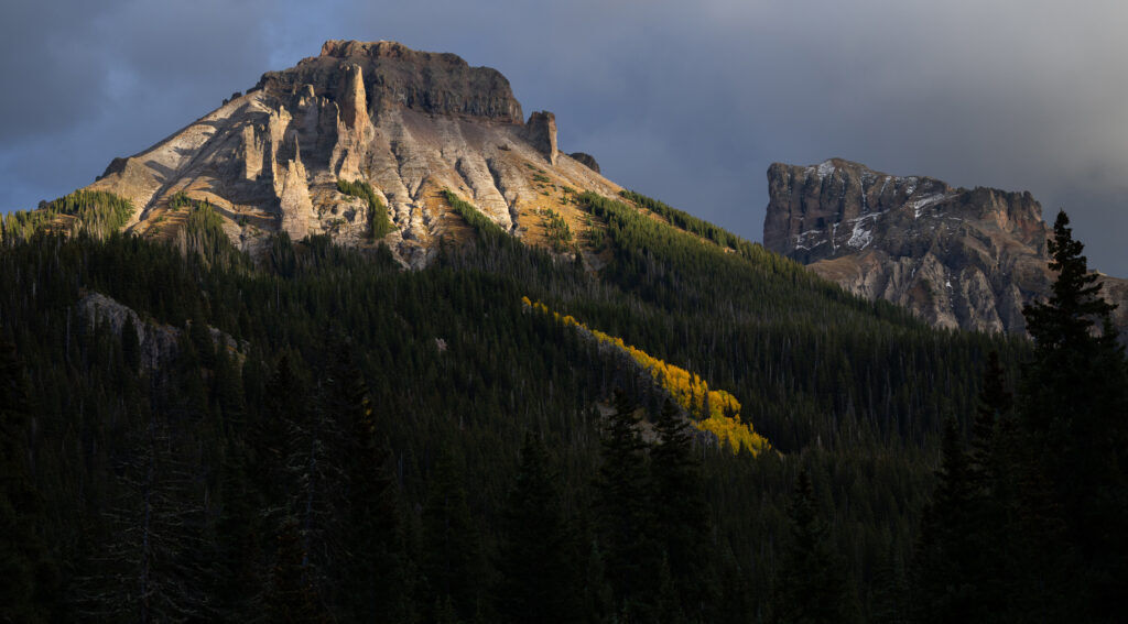 The afternoon sun spotlights Chimney Rock and Courthouse Mountain on Owl Creek Pass near Ridgway, Colo., on Monday, Sept. 29, 2025. (The Gazette, Christian Murdock)