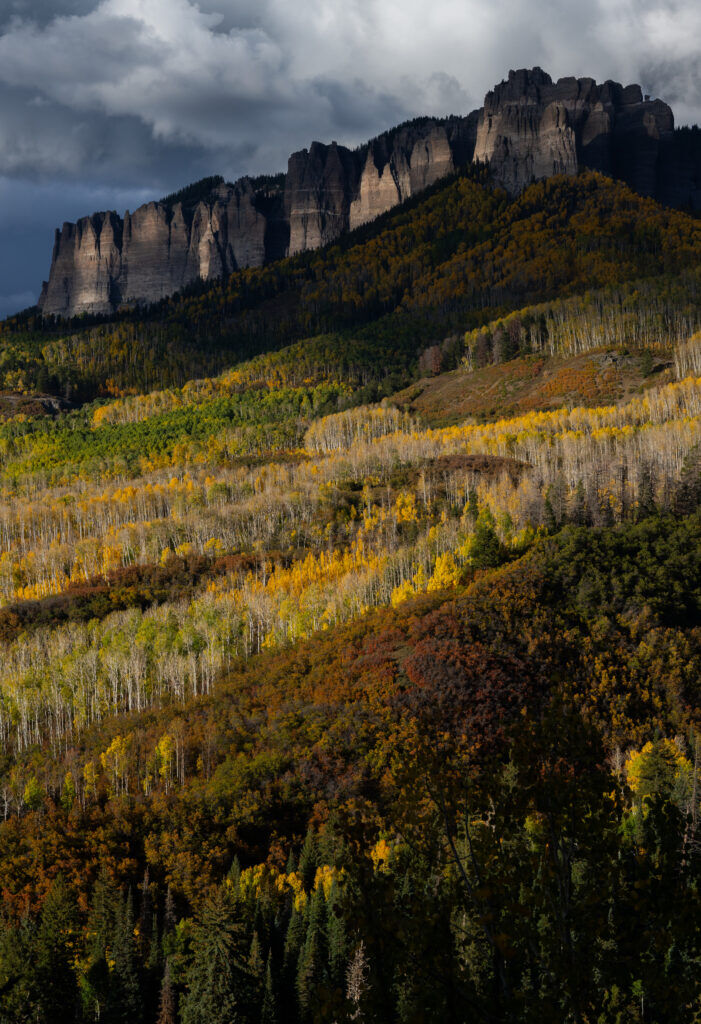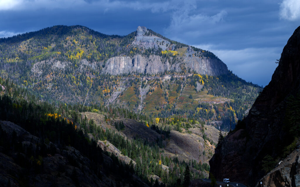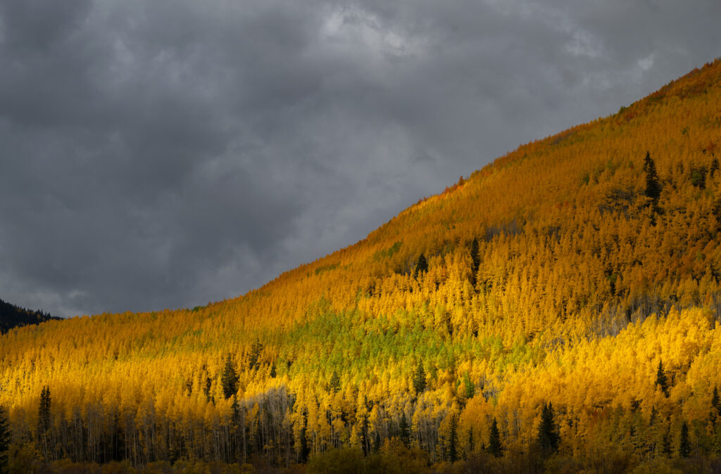 The turning aspens show their colors in the morning sun as storm clouds build in the background Tuesday, Sept. 30, 2025, on Red Mountain Pass between Ouray and Silverton, Colo. (The Gazette, Christian Murdock)