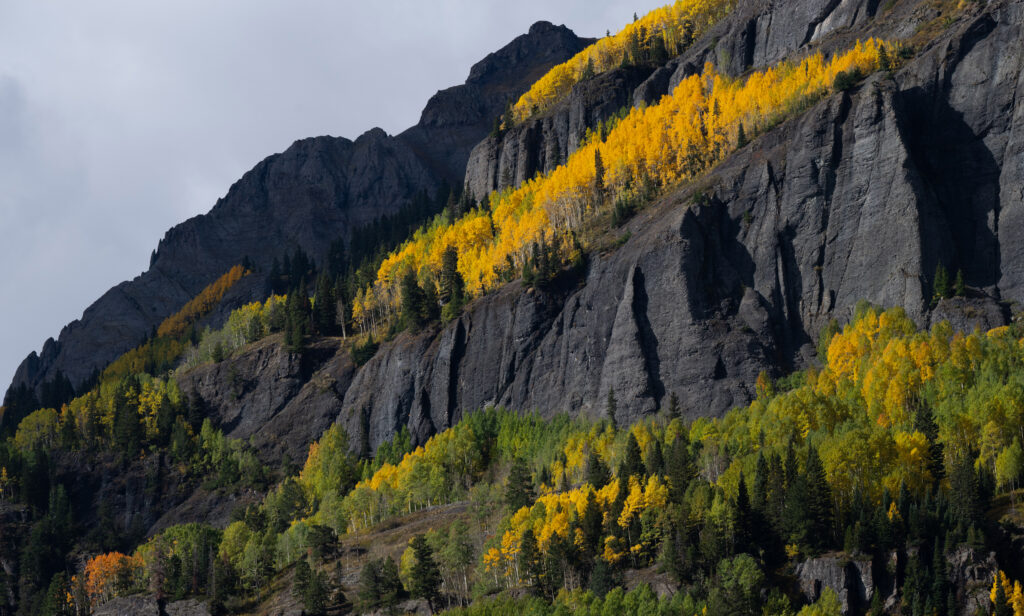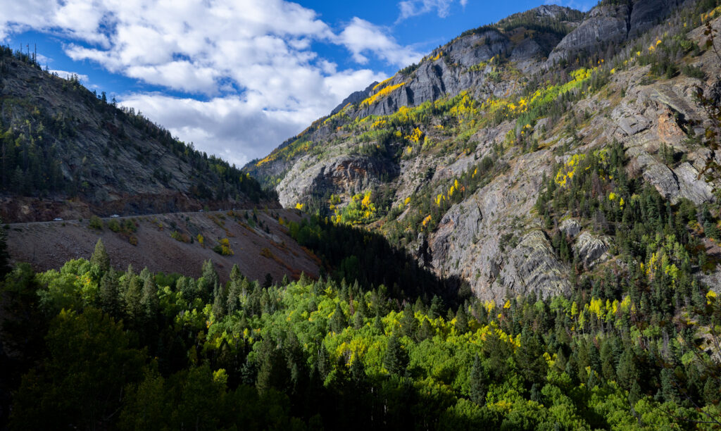 Aspen turn yellow above the Million Dollar Highway, U.S. Route 550, between Ouray and Silverton, Colo., on Tuesday, Sept. 30, 2025. (The Gazette, Christian Murdock)