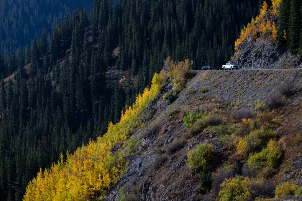 Motorist drive Red Mountain Pass between Ouray and Silverton, Colo., on Tuesday, Sept. 30, 2025, as the aspens turn. (The Gazette, Christian Murdock)
