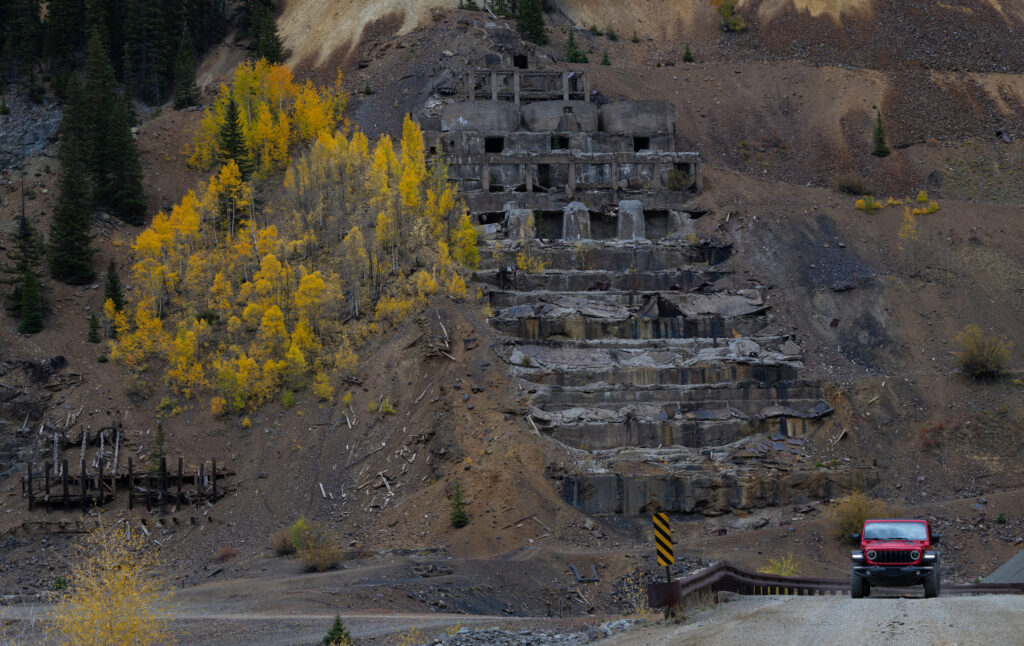 A jeep passes some of Colorado’s mining history as the aspens turn outside Silverton, Colo., on Tuesday, Sept. 30, 2025. (The Gazette, Christian Murdock)
