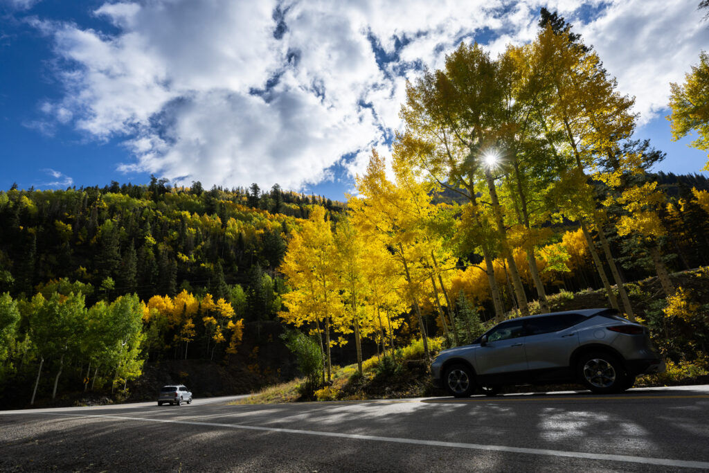Motorists drive through the changing aspens making their way south on U.S. Route 550, the Million Dollar Highway, between Ouray and Silverton, Colo., on Tuesday, Sept. 30, 2025. (The Gazette, Christian Murdock)