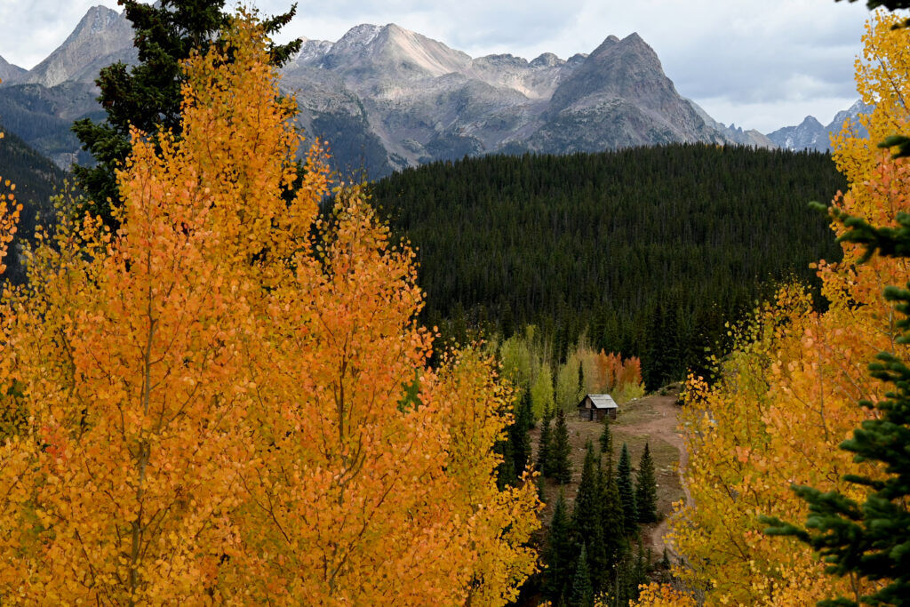 An old mining cabin is framed between a pair of aspen trees on Sunday, Sept. 29, 2025, with the San Juan Mountains in the background on Colorado Highway 550 south of Silverton. The cabin has been a destination for photographers in recent years thanks to its rustic look and the surrounding forest. (The Gazette, Jon Mitchell)