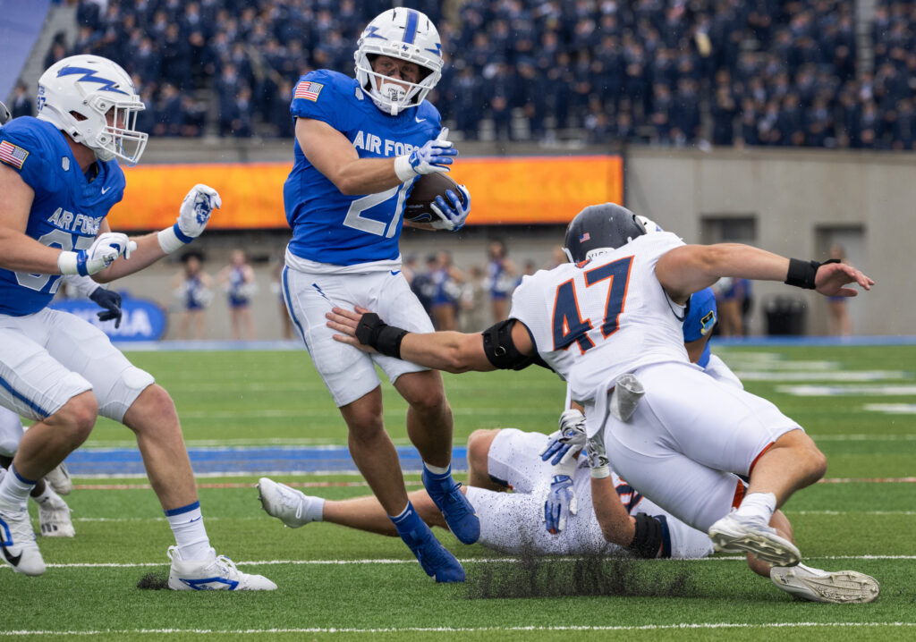 Air Force Falcons wide receiver Cade Harris (21 runs past the tackle of Bucknell Bison linebacker Jack Goheen (47) during the first half Saturday, Aug. 30, 2025, at Falcon Stadium. (The Gazette, Christian Murdock)Worth noting: Cade Harris