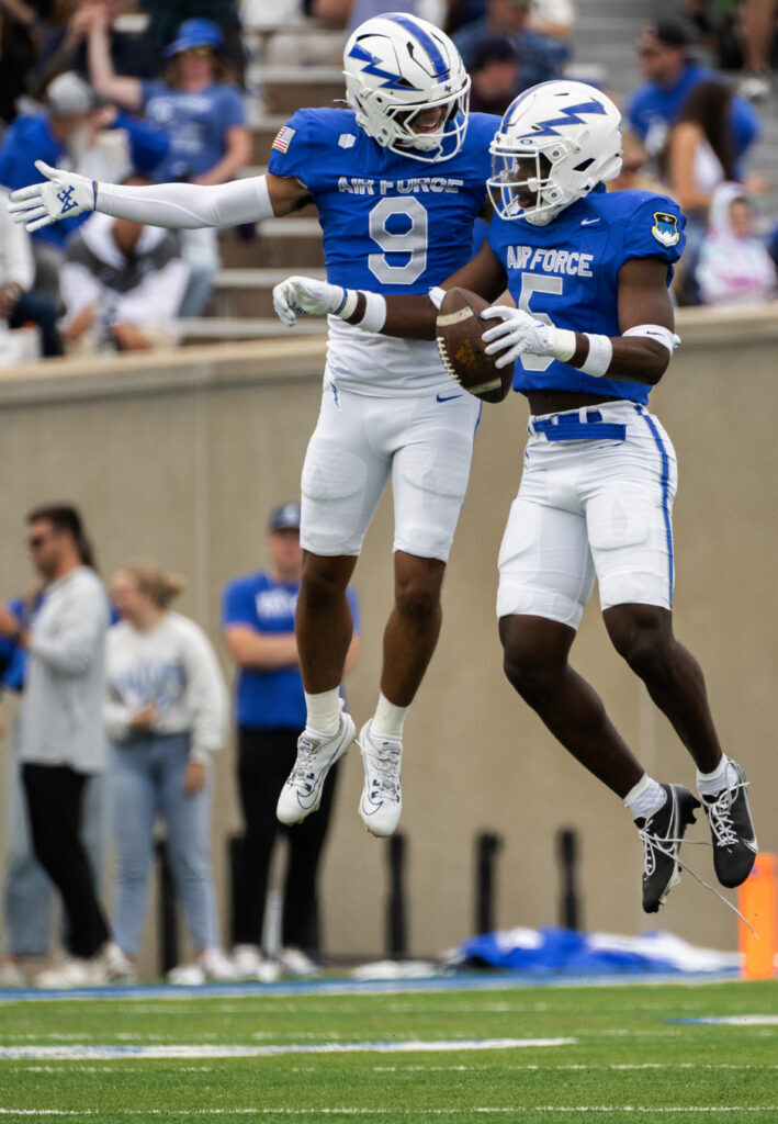 Air Force Falcons defensive back Roger Jones Jr. (5) celebrates with Air Force Falcons cornerback Levi Brown (9) after intecepting a Bucknell Bison pass during the first half Saturday, Aug. 30, 2025, at Falcon Stadium. (The Gazette, Christian Murdock)Key stat, Part 2:9