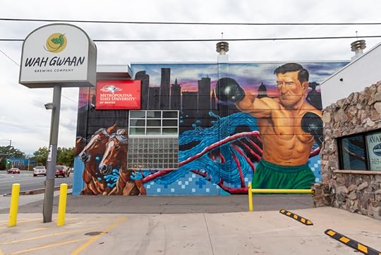 The mural designed and painted by a collective of five local artists wraps the building’s corner. In the alley off 8th Avenue, what first hits the eye is an enormous painting of a beefy boxer throwing a punch.