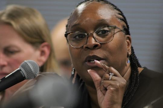 Denver School Board Director Michelle Quattlebaum motioned with her hand during an April 14, 2025 meeting. (Photo by: Nicole C. Brambila/The Denver Gazette.) “Every board member had an opportunity to add their own comments, make their own recommendations and strike any recommendations that they did not agree with,” Quattlebaum said before the May 1 vote.