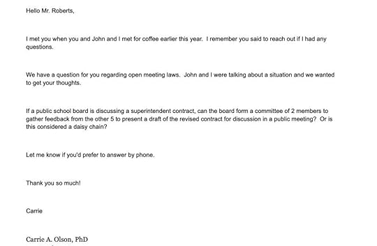 “If a public school board is discussing a superintendent contract, can the board form a committee of 2 members to gather feedback from the other 5 to present a draft of the revised contract for discussion in a public meeting? Or is this considered a daisy chain,” Olson asked Roberts in an April 8 email obtained under CORA.