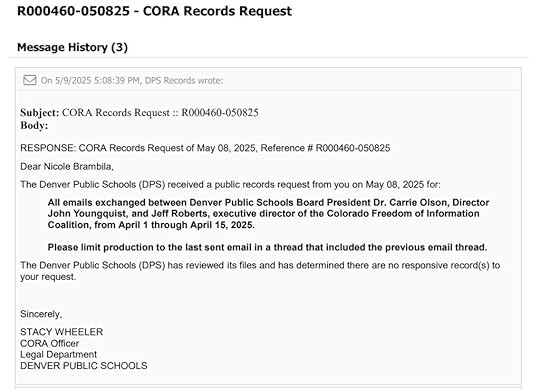The Denver Gazette submitted two CORA requests, the first one having been denied, for the April 8, 2025 email Board President Carrie Olson sent to The Colorado Freedom of Information Coalition. This is a screenshot of the district’s denial.“This is not an isolated incident,” Zansberg has said about the board’s actions. “I think it’s irrefutable that there is a pattern of conduct that the district has not abided by the state’s transparency laws.”