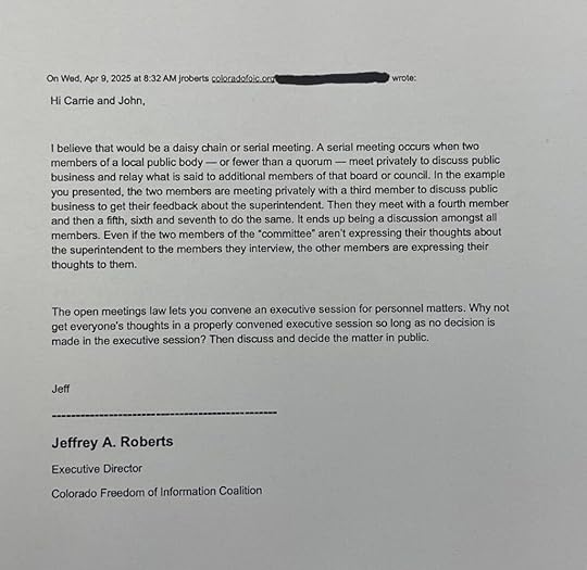 In an April 9, 2025 email, Jeff Roberts, executive director of the Colorado Freedom of Information Coalition, told Board President Carrie Olson that a two-member committee could amount to a ‘daisy chain’ meeting that violates state law.Roberts recommended — a week after the board had tried and failed — to convene an executive session for personnel matters.
